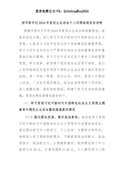【七哥公文】2025年:团市委书记2024年度民主生活会个人对照检视发言材料+更多免费公文+VX:QiGeGongWen2024+更多免费公文+VX:QiGeGongWen2024