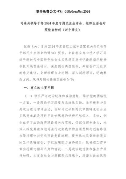 【七哥公文】2025年:司法局领导干部2024年度专题民主生活会、组织生活会对照检查材料(四个带头)+更多免费公文+VX:QiGeGongWen2024+更多免费公文+VX:QiGeGongWen2024
