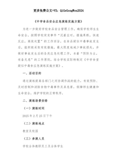 【七哥公文】2025年:《中学食品安全应急演练实施方案》+更多免费公文+VX:QiGeGongWen2024+更多免费公文+VX:QiGeGongWen2024