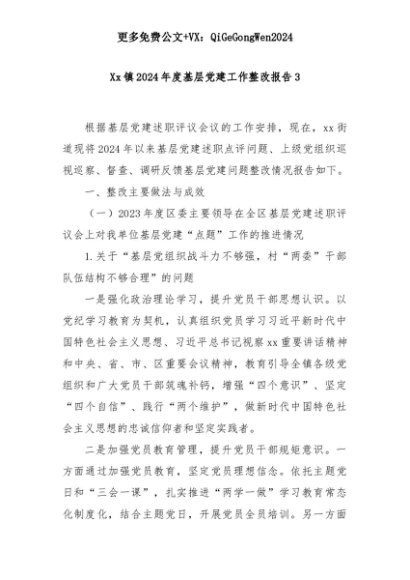 【七哥公文】2025年:Xx镇2024年度基层党建工作整改报告3+更多免费公文+VX:QiGeGongWen2024+更多免费公文+VX:QiGeGongWen2024