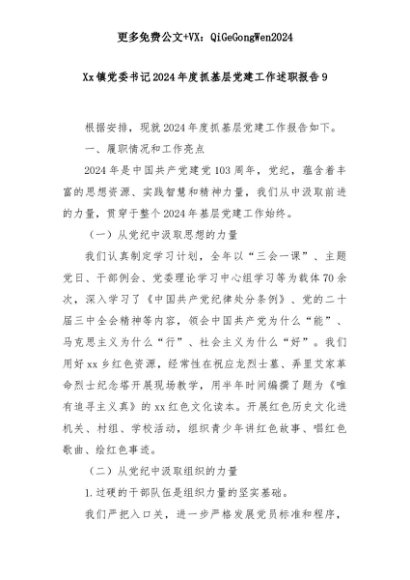 【七哥公文】2025年:Xx镇党委书记2024年度抓基层党建工作述职报告9+更多免费公文+VX:QiGeGongWen2024+更多免费公文+VX:QiGeGongWen2024