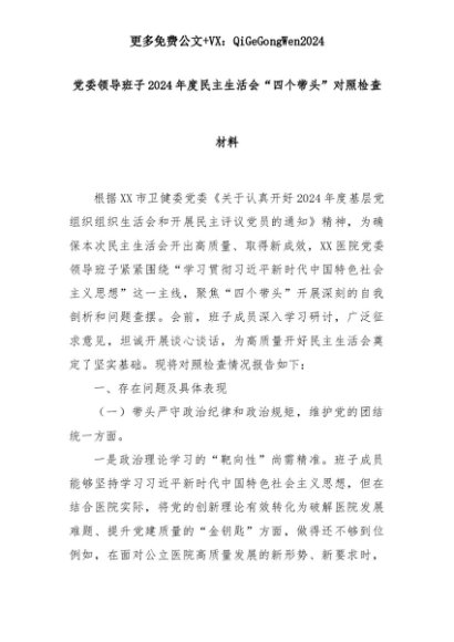 【七哥公文】2025年:党委领导班子2024年度民主生活会“四个带头”对照检查材料+更多免费公文+VX:QiGeGongWen2024+更多免费公文+VX:QiGeGongWen2024