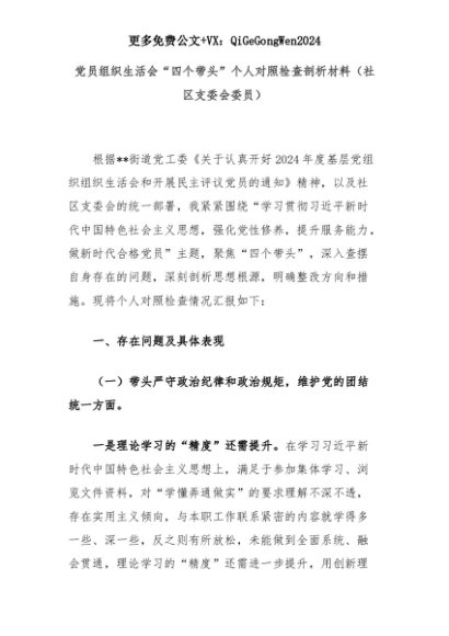 【七哥公文】2025年:党员组织生活会“四个带头”个人对照检查剖析材料(社区支委会委员)+更多免费公文+VX:QiGeGongWen2024+更多免费公文+VX:QiGeGongWen2024