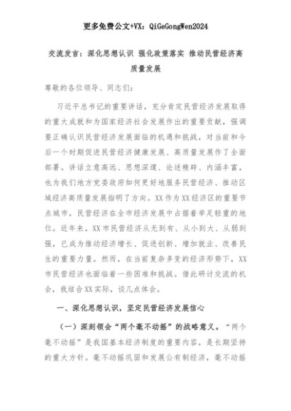 【七哥公文】2025年:交流发言:深化思想认识 强化政策落实 推动民营经济高质量发展+更多免费公文+VX:QiGeGongWen2024+更多免费公文+VX:QiGeGongWen2024
