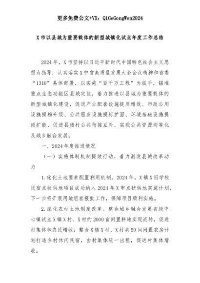 【七哥公文】2025年:X市以县城为重要载体的新型城镇化试点年度工作总结+更多免费公文+VX:QiGeGongWen2024+更多免费公文+VX:QiGeGongWen2024