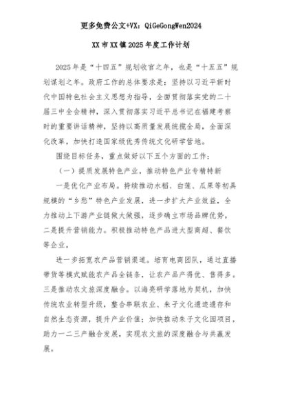 【七哥公文】2025年:XX市XX镇2025年度工作计划+更多免费公文+VX:QiGeGongWen2024+更多免费公文+VX:QiGeGongWen2024