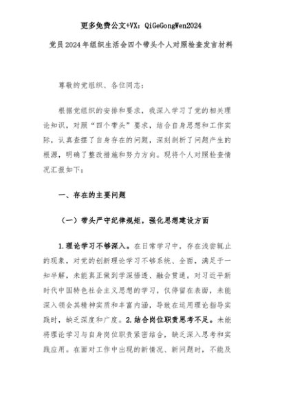 【七哥公文】2025年:党员2024年组织生活会四个带头个人对照检查发言材料+更多免费公文+VX:QiGeGongWen2024+更多免费公文+VX:QiGeGongWen2024