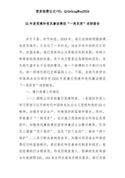 【七哥公文】2025年:XX年度党建和党风廉洁建设“一岗双责”述职报告+更多免费公文+VX:QiGeGongWen2024+更多免费公文+VX:QiGeGongWen2024