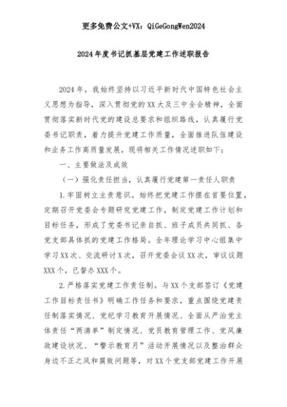 【七哥公文】2025年:2024年度书记抓基层党建工作述职报告+更多免费公文+VX:QiGeGongWen2024+更多免费公文+VX:QiGeGongWen2024
