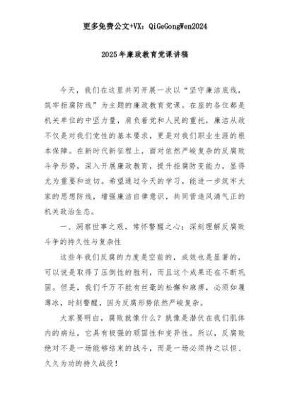 【七哥公文】2025年:2025年廉政教育党课讲稿+更多免费公文+VX:QiGeGongWen2024+更多免费公文+VX:QiGeGongWen2024