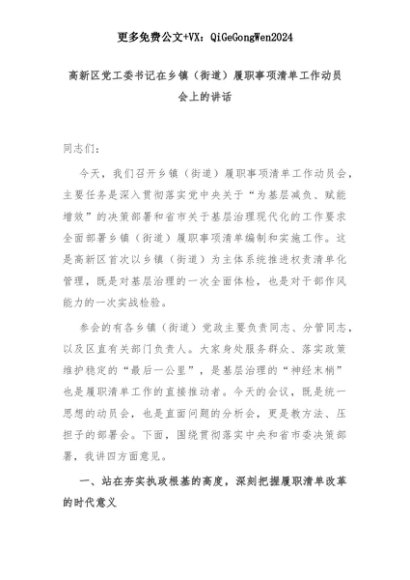 【七哥公文】2025年:高新区党工委书记在乡镇(街道)履职事项清单工作动员会上的讲话+更多免费公文+VX:QiGeGongWen2024+更多免费公文+VX:QiGeGongWen2024