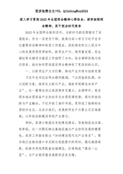 【七哥公文】2025年:深入学习贯彻2025年全国两会精神心得体会:深学细悟两会精神,实干担当时代使命+更多免费公文+VX:QiGeGongWen2024+更多免费公文+VX:QiGeGongWen2024