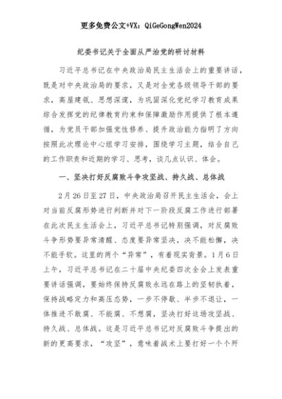 【七哥公文】2025年:纪委书记关于全面从严治党的研讨材料+更多免费公文+VX:QiGeGongWen2024+更多免费公文+VX:QiGeGongWen2024