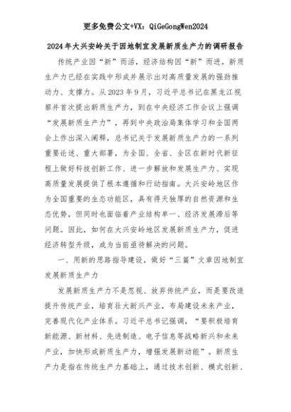 【七哥公文】2025年:2024年大兴安岭关于因地制宜发展新质生产力的调研报告+更多免费公文+VX:QiGeGongWen2024+更多免费公文+VX:QiGeGongWen2024