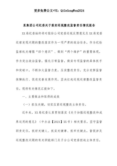 【七哥公文】2025年:某集团公司纪委关于落实巡视整改监督责任情况报告+更多免费公文+VX:QiGeGongWen2024+更多免费公文+VX:QiGeGongWen2024