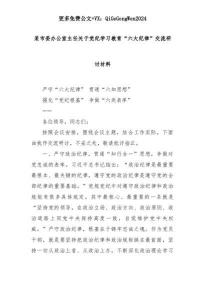 【七哥公文】2025年:某市委办公室主任关于党纪学习教育“六大纪律”交流研讨材料+更多免费公文+VX:QiGeGongWen2024+更多免费公文+VX:QiGeGongWen2024