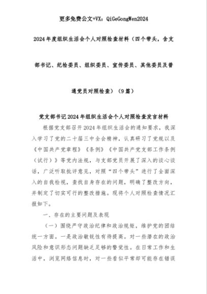 【七哥公文】2025年:(9篇)2024年度组织生活会个人对照检查材料(四个带头,含支部书记、纪检委员、组织委员、宣传委员、其他委员及普通党员对照检查)+更多免费公文+VX:QiGeGongWen2024+更多免费公文+VX:QiGeGongWen2024