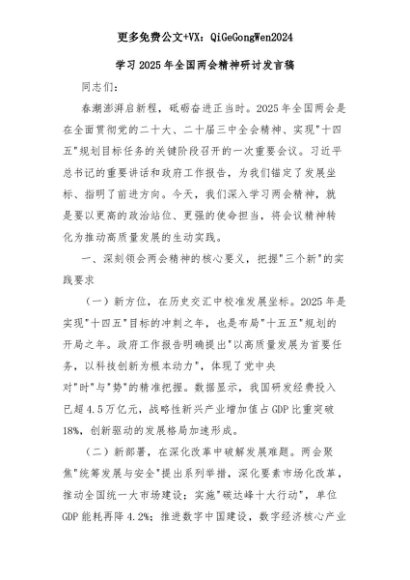 【七哥公文】2025年:学习2025年全国两会精神研讨发言稿+更多免费公文+VX:QiGeGongWen2024+更多免费公文+VX:QiGeGongWen2024