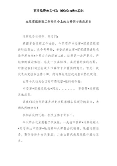 【七哥公文】2025年:在巡察组进驻工作动员会上的主持词与表态发言+更多免费公文+VX:QiGeGongWen2024+更多免费公文+VX:QiGeGongWen2024