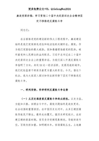 【七哥公文】2025年:廉政党课讲稿:学习贯彻二十届中央纪委四次全会精神坚定不移推进反腐败斗争+更多免费公文+VX:QiGeGongWen2024+更多免费公文+VX:QiGeGongWen2024