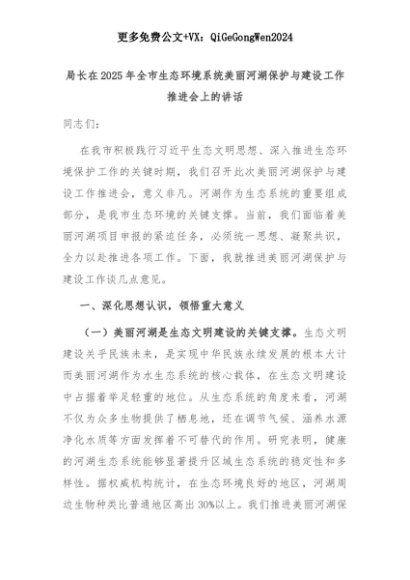 【七哥公文】2025年:局长在2025年全市生态环境系统美丽河湖保护与建设工作推进会上的讲话+更多免费公文+VX:QiGeGongWen2024+更多免费公文+VX:QiGeGongWen2024