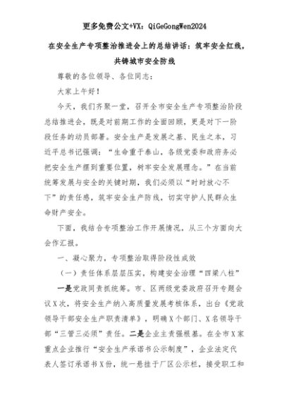 【七哥公文】2025年:在安全生产专项整治推进会上的总结讲话:筑牢安全红线,共铸城市安全防线+更多免费公文+VX:QiGeGongWen2024+更多免费公文+VX:QiGeGongWen2024