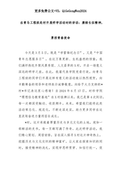 【七哥公文】2025年:在青马工程班赴村开展研学活动时的讲话:赓续长征精神,勇担青春使命+更多免费公文+VX:QiGeGongWen2024+更多免费公文+VX:QiGeGongWen2024