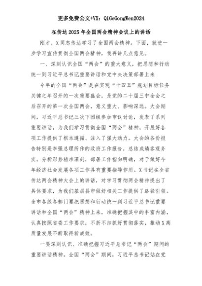 【七哥公文】2025年:在传达2025年全国两会精神会议上的讲话+更多免费公文+VX:QiGeGongWen2024+更多免费公文+VX:QiGeGongWen2024