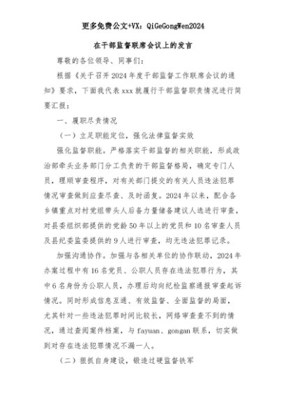 【七哥公文】2025年:在干部监督联席会议上的发言+更多免费公文+VX:QiGeGongWen2024+更多免费公文+VX:QiGeGongWen2024