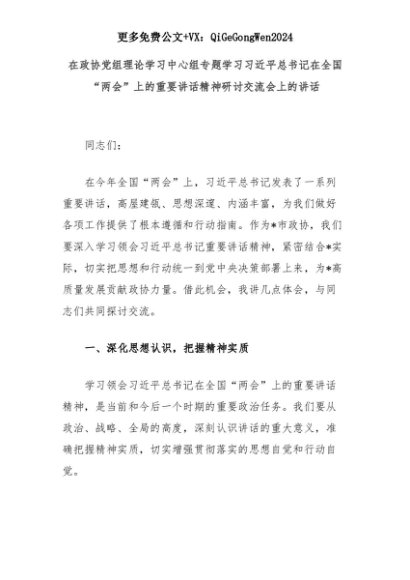 【七哥公文】2025年:在政协党组理论学习中心组专题学习习近平总书记在全国“两会”上的重要讲话精神研讨交流会上的讲话+更多免费公文+VX:QiGeGongWen2024+更多免费公文+VX:QiGeGongWen2024