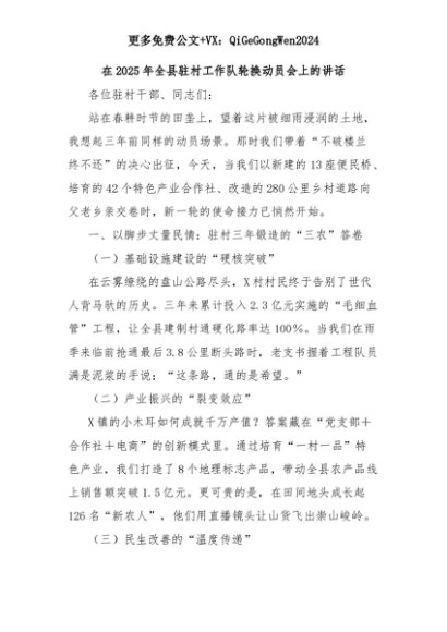 【七哥公文】2025年:在2025年全县驻村工作队轮换动员会上的讲话+更多免费公文+VX:QiGeGongWen2024+更多免费公文+VX:QiGeGongWen2024