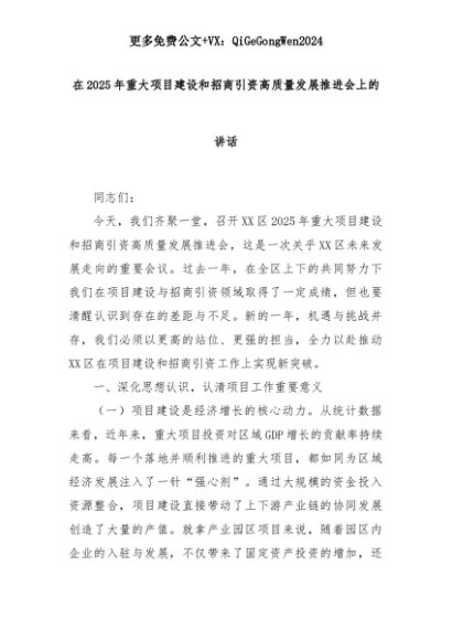 【七哥公文】2025年:在2025年重大项目建设和招商引资高质量发展推进会上的讲话+更多免费公文+VX:QiGeGongWen2024+更多免费公文+VX:QiGeGongWen2024