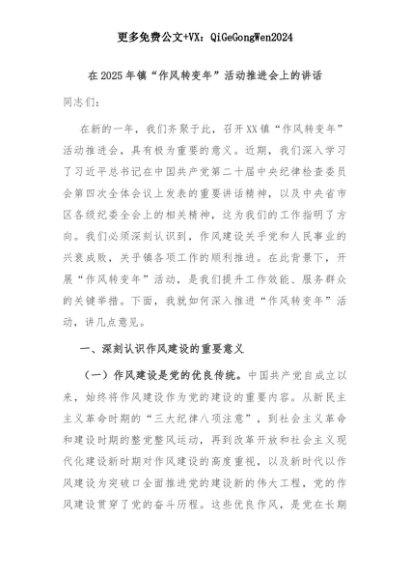 【七哥公文】2025年:在2025年镇“作风转变年”活动推进会上的讲话+更多免费公文+VX:QiGeGongWen2024+更多免费公文+VX:QiGeGongWen2024