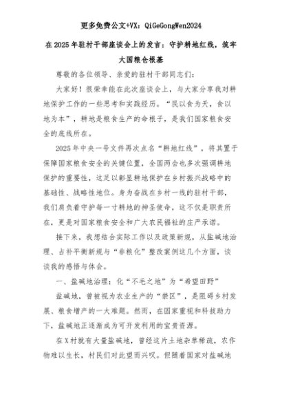 【七哥公文】2025年:在2025年驻村干部座谈会上的发言:守护耕地红线,筑牢大国粮仓根基+更多免费公文+VX:QiGeGongWen2024+更多免费公文+VX:QiGeGongWen2024