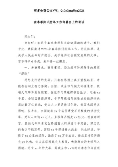 【七哥公文】2025年:在春季防汛防旱工作部署会上的讲话+更多免费公文+VX:QiGeGongWen2024+更多免费公文+VX:QiGeGongWen2024