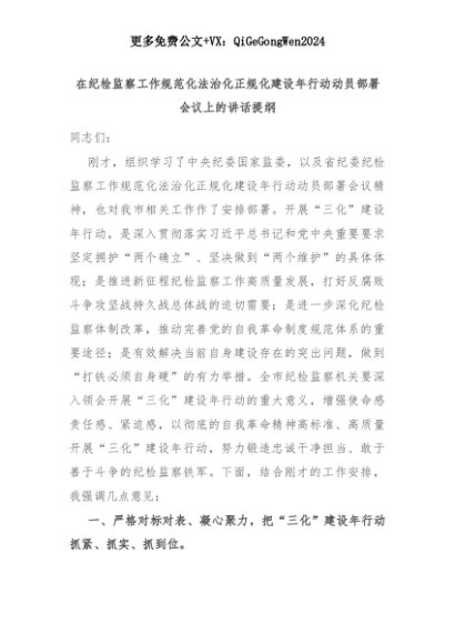 【七哥公文】2025年:在纪检监察工作规范化法治化正规化建设年行动动员部署会议上的讲话提纲+更多免费公文+VX:QiGeGongWen2024+更多免费公文+VX:QiGeGongWen2024