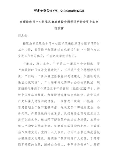【七哥公文】2025年:在理论学习中心组党风廉政建设专题学习研讨会议上的交流发言+更多免费公文+VX:QiGeGongWen2024+更多免费公文+VX:QiGeGongWen2024