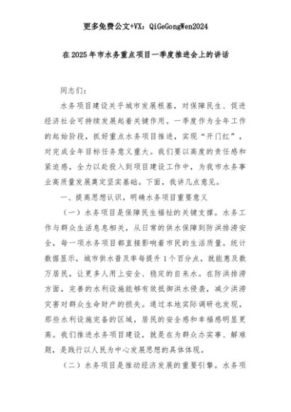 【七哥公文】2025年:在2025年市水务重点项目一季度推进会上的讲话+更多免费公文+VX:QiGeGongWen2024+更多免费公文+VX:QiGeGongWen2024