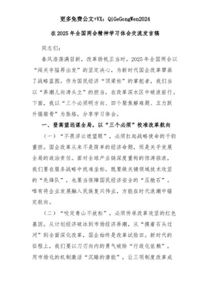 【七哥公文】2025年:在2025年全国两会精神学习体会交流发言稿+更多免费公文+VX:QiGeGongWen2024+更多免费公文+VX:QiGeGongWen2024