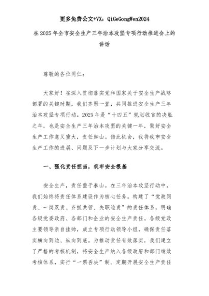 【七哥公文】2025年:在2025年全市安全生产三年治本攻坚专项行动推进会上的讲话+更多免费公文+VX:QiGeGongWen2024+更多免费公文+VX:QiGeGongWen2024