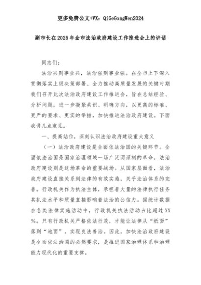 【七哥公文】2025年:副市长在2025年全市法治政府建设工作推进会上的讲话+更多免费公文+VX:QiGeGongWen2024+更多免费公文+VX:QiGeGongWen2024