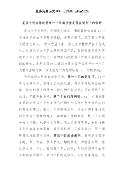 【七哥公文】2025年:县委书记在推进县第一中学高质量发展座谈会上的讲话+更多免费公文+VX:QiGeGongWen2024+更多免费公文+VX:QiGeGongWen2024
