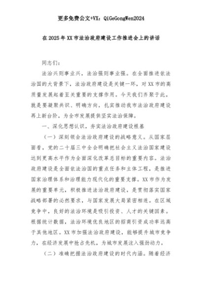 【七哥公文】2025年:在2025年XX市法治政府建设工作推进会上的讲话+更多免费公文+VX:QiGeGongWen2024+更多免费公文+VX:QiGeGongWen2024