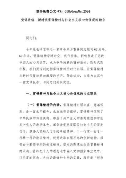【七哥公文】2025年:党课讲稿:新时代雷锋精神与社会主义核心价值观的融合+更多免费公文+VX:QiGeGongWen2024+更多免费公文+VX:QiGeGongWen2024