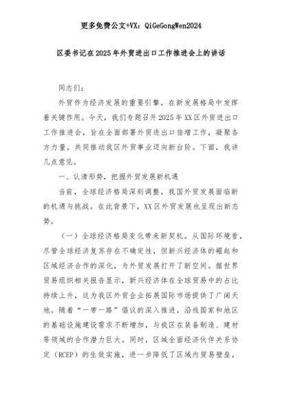 【七哥公文】2025年:区委书记在2025年外贸进出口工作推进会上的讲话+更多免费公文+VX:QiGeGongWen2024+更多免费公文+VX:QiGeGongWen2024