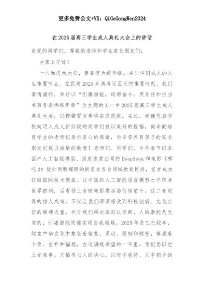 【七哥公文】2025年:在2025届高三学生成人典礼大会上的讲话+更多免费公文+VX:QiGeGongWen2024+更多免费公文+VX:QiGeGongWen2024