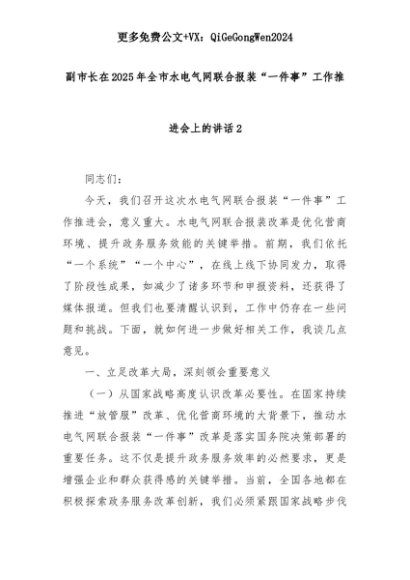 【七哥公文】2025年:副市长在2025年全市水电气网联合报装“一件事”工作推进会上的讲话2+更多免费公文+VX:QiGeGongWen2024+更多免费公文+VX:QiGeGongWen2024