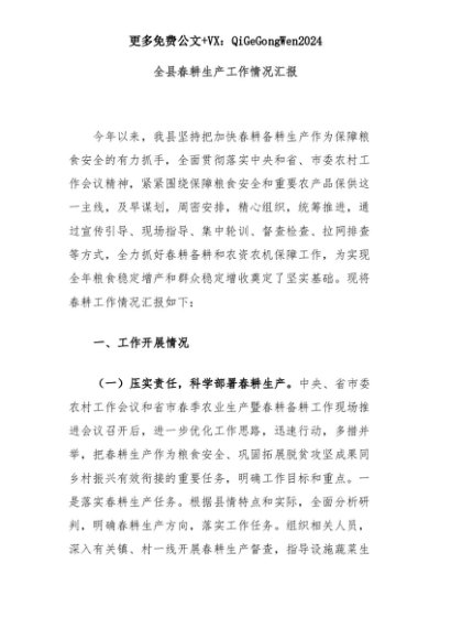 【七哥公文】2025年:全县春耕生产工作情况汇报+更多免费公文+VX:QiGeGongWen2024+更多免费公文+VX:QiGeGongWen2024
