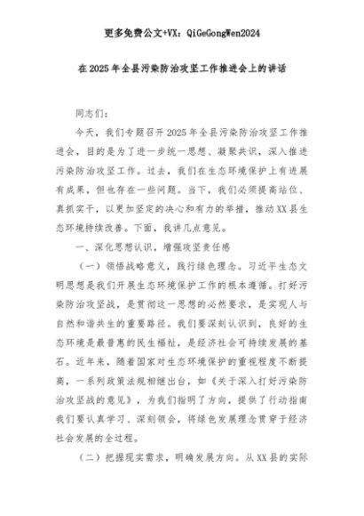 【七哥公文】2025年:在2025年全县污染防治攻坚工作推进会上的讲话+更多免费公文+VX:QiGeGongWen2024+更多免费公文+VX:QiGeGongWen2024