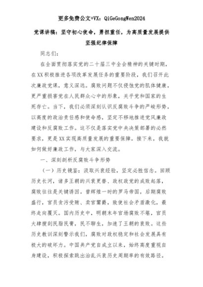 【七哥公文】2025年:党课讲稿:坚守初心使命,勇担重任,为高质量发展提供坚强纪律保障+更多免费公文+VX:QiGeGongWen2024+更多免费公文+VX:QiGeGongWen2024